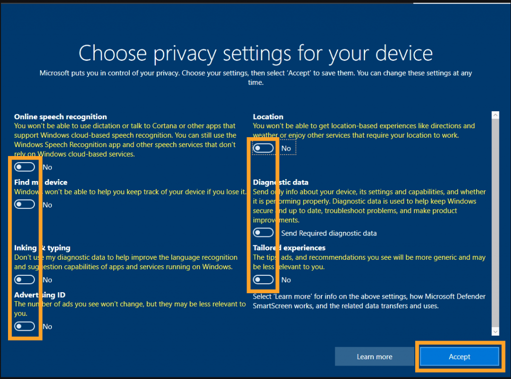 \- Turn **OFF** all privacy questions/settings